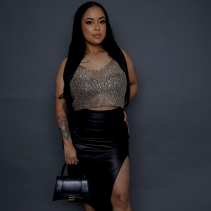 Perfect for the sophisticated night out, our Bella Gold Metallic Top illuminates your look with glittery, shimmering appeal. Its exquisite design pairs a delicate see-through material with gleaming metallic accents for an effortless style that will make you stand out at any event.