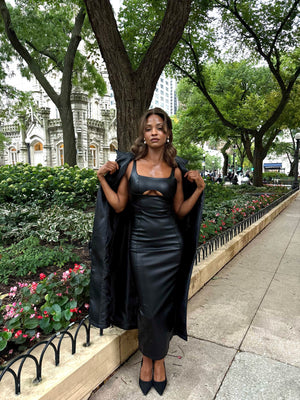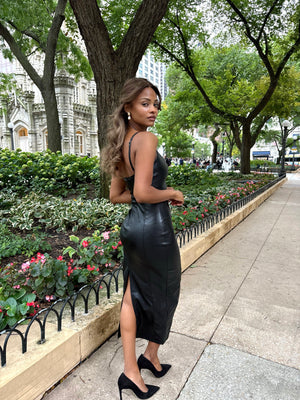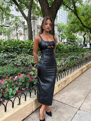 This long leather dress features a striking cut-out design that exudes confidence wherever you go. Adjustable shoulder straps ensure a tailored fit, enhancing your silhouette with elegance and ease.