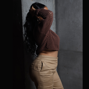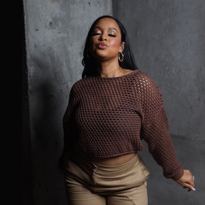 This brown wash off color knit top provides an excellent texture, perfect for making any outfit look more sophisticated, and stand out from the rest. With its unique and sheer fabric, the top can be layered to add an extra touch of style. Made with a lightweight and knit fabric, this top is the perfect addition to any wardrobe for the upcoming seasons