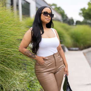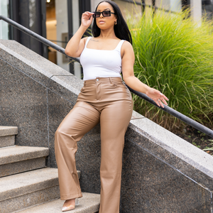 Our Caramel Leather Pants are the perfect pants to complete your fall wardrobe capsule. These faux vegan leather pants are perfectly cut with a fitted high-rise waist and a straight leg, finished with both front and back pockets. These pants offer an effortless transition from day to night.
