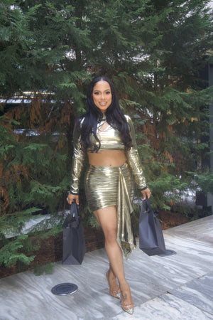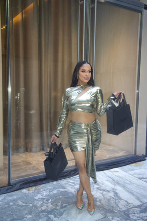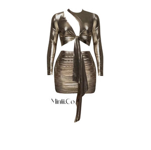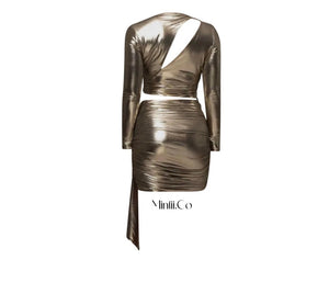 Step into the spotlight with the Gold Metallic Cut Out Dress, designed to captivate and elevate your evening look. Crafted from high-quality, breathable stretch fabric, it ensures comfort while accentuating your curve. The elegant cut-out details add a daring touch, perfect for making a memorable entrance. Pair with delicate heels to enhance your poise and confidence throughout the night.
