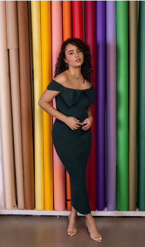 Elevate your wardrobe with our Green Bow Mindi Dress. Its midi style delicately hugs your curves, while the off-the-shoulder design adds a touch of sensuality. Perfect for an intimate dinner or a special occasion, this dress exudes sophistication and class. Dress to impress with this must-have for any fashion-forward woman.