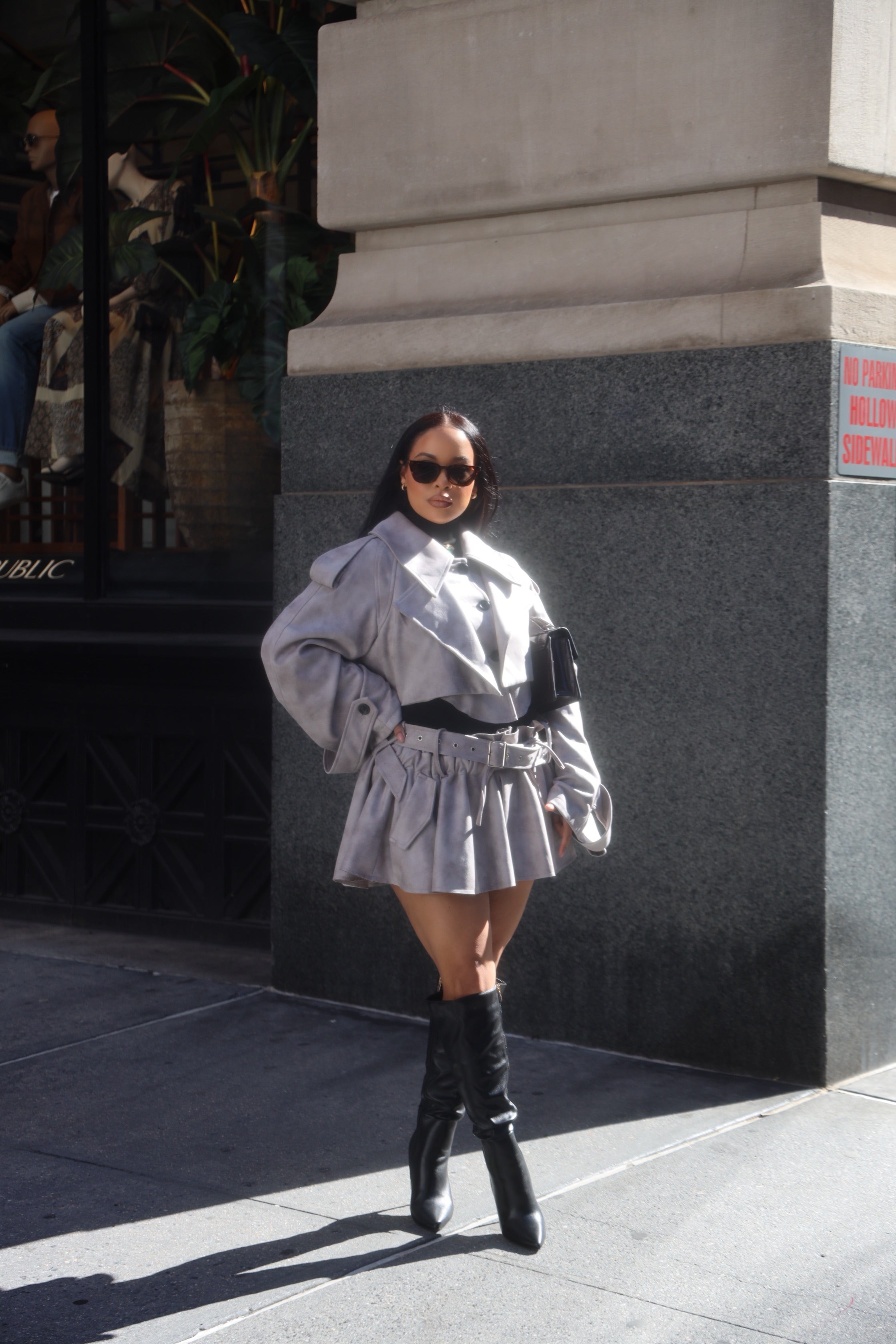 This luxury grey belted coat and mini skirt set brings chic sophistication to your street-style look. Perfectly tailored with a modern baggy edge, it’s designed to make a statement wherever you go. Suede Trench that gives stylist and pair it with your favorite pants.