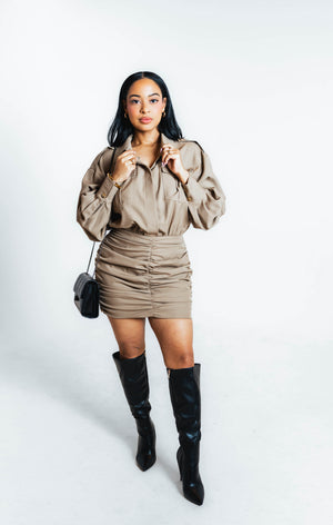 Style this beige half-button dress a dozen different ways—dress it up solo or layer it for extra flair. It's the wardrobe MVP that works as hard as you do, transforming from polished to casual in seconds. With that satisfying crunch fabric and effortless silhouette, it's basically your new favorite piece that does it all.