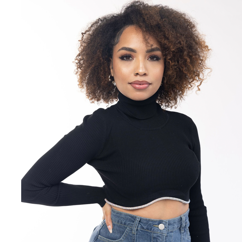Elevate your wardrobe with a simple touch by adding this elegant turtle neck Crop Top. Adorned with colorful stone details, this piece exudes sophistication and adds a touch of sexiness to your look. Perfect for an evening outing.