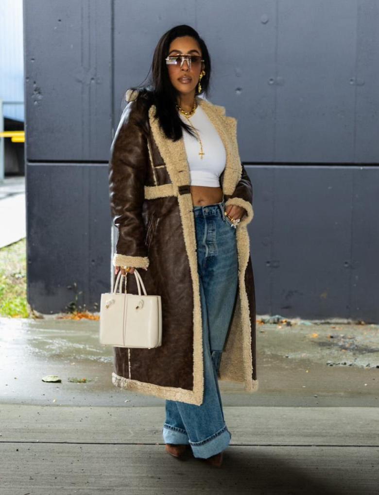 This luxurious Fall gear is the ultimate in style and versatility. Be a fashionista with multiple ways to wear it, from day to night outings. Middle part offers a zipper to change to cropped tranch. Wool-lined on the inside and leather on the outside, this jacket is both fashionable and cozy. Model is wearing size Large.