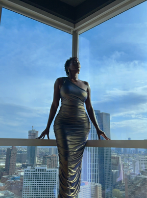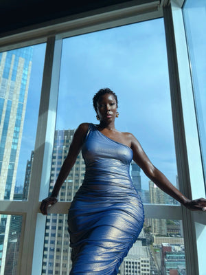 Elegant form-fitting silhouette crafted from shimmering blue mesh with subtle gold accents. The asymmetrical single sleeve design offers distinguished sophistication, while thoughtfully gathered side details accentuate the natural feminine form. This lightweight garment drapes gracefully, providing both refined comfort and unrestricted movement for the discerning wearer.