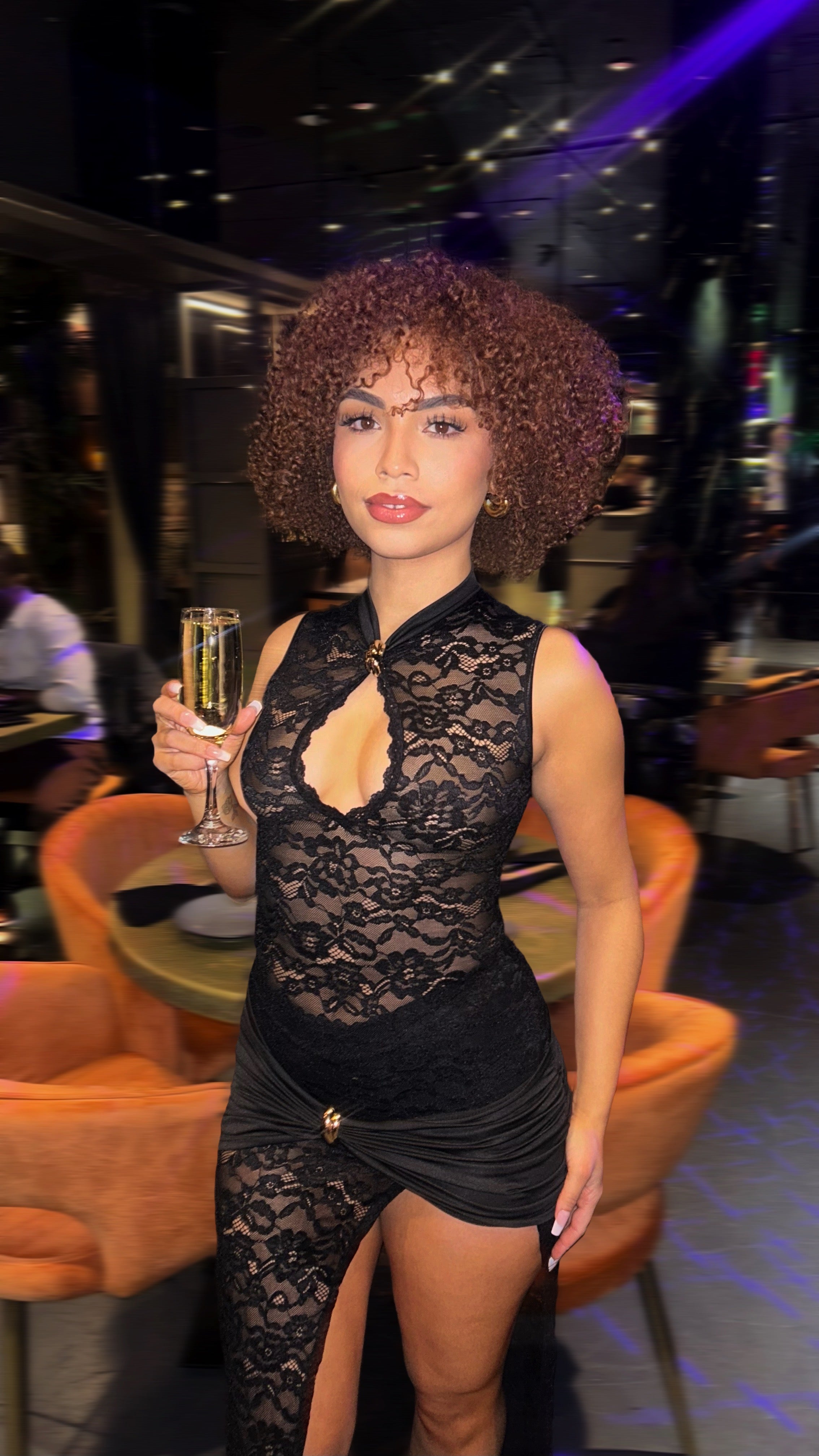 Elevate your style this season with our daring Revenge Black Lace Dress! From the sultry zipper back halter top, to the sheer lace fabric cascading all the way down, this dress exudes confidence and sophistication. Adorned with gold charms at the neckline and hip, this dress adds a touch of chic to your wardrobe. Get ready to release your creativity and embrace the risk-taking attitude ofthis edgy dress. Don't be afraid to stand out in the crowd!