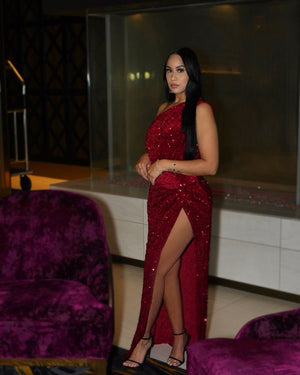 Feel extraordinary in this carefully crafted Rubi Red Sparkle Dress. Crafted from luxurious velvet, this dress features detailed sequins sewn in to elevate your look. An eye-catching high thigh split and one over the shoulder side off give this dress a unique statement.