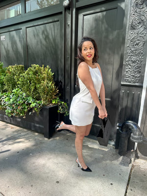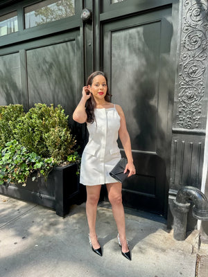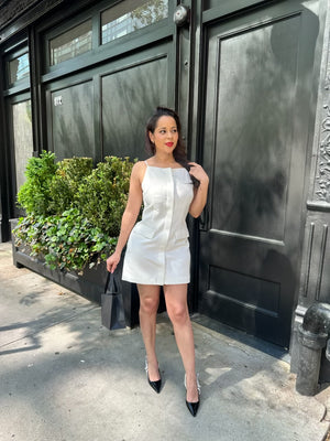 This mini dress effortlessly enhances any occasion’s ambiance. Perfect for brunch or a dinner out, its design draws inspiration from a tailored blazer, featuring snap buttons at the waist for a refined touch. Whether aiming for a polished or more casual look, this dress adapts gracefully to suit your style with understated elegance.